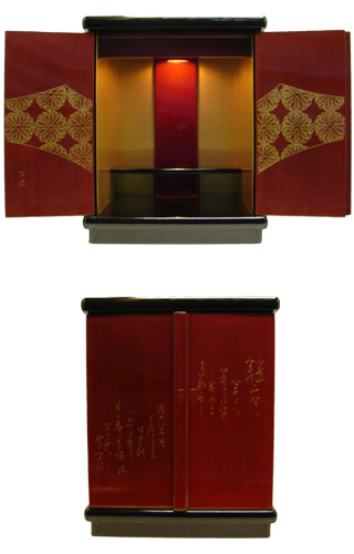 すべて天然うるしを使用し、外側は紅溜の極上呂色磨き仕上げ、内部は総純金粉仕上げ、さらに扉の内側には菊紋様、外側に和歌を小林正輝が沈金しました。赤と黒のコントラストが際立つ逸品です。