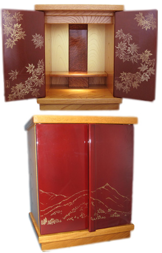 厚板のタモ材を本体に使用しました。扉部分には天然うるしを極上呂色磨きし、斉藤朱美による美しい「もみじ」を沈金しました。非常に趣のある作品です。